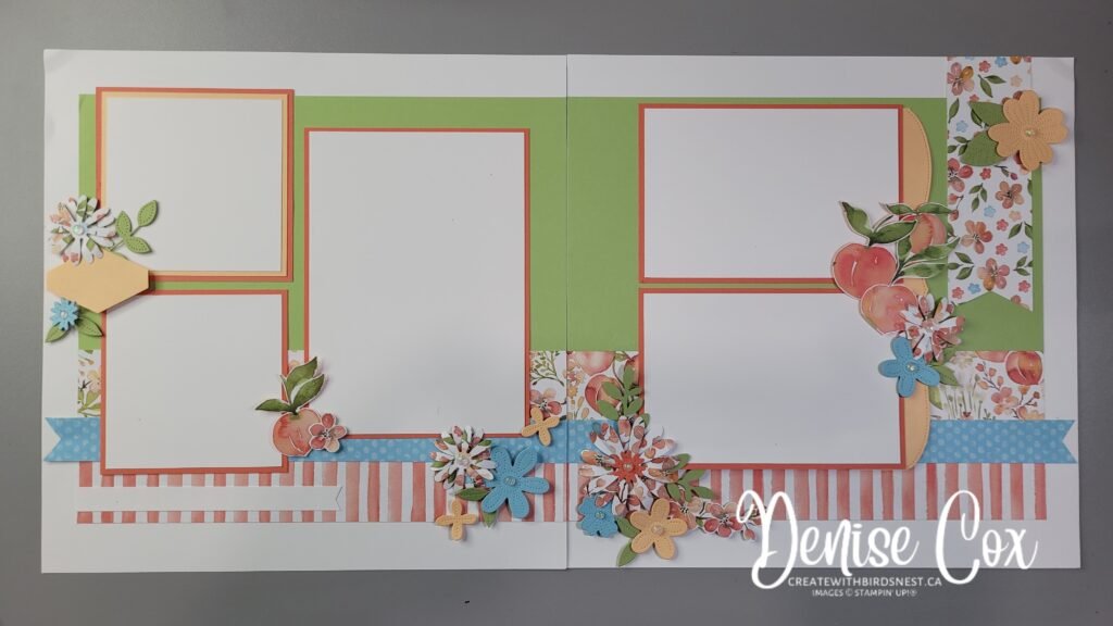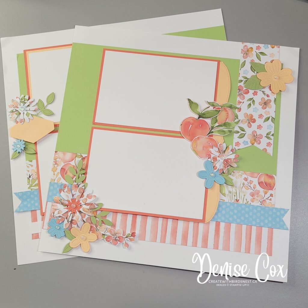 These pages are the ones that I designed for my monthly Scrapbook Club for March. Each member received a kit with all of the pieces and instructions to complete the double You’re A Peach layout. This gorgeous designer series paper and assortment of die cut and punched flowers makes for a wonderfully colourful spring themed layout. I love all of the versatility and possibilities of Stampin’ Up! products.