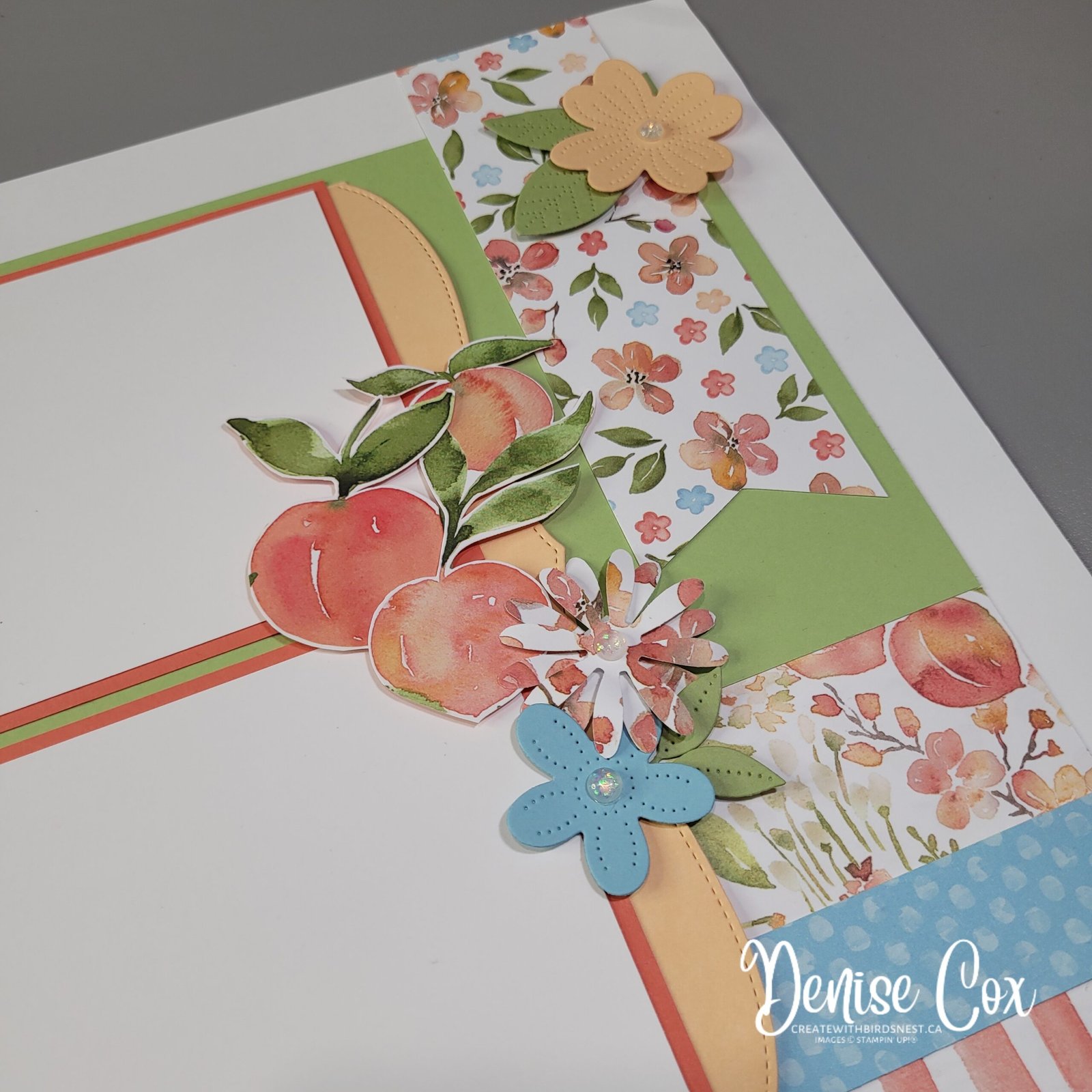 All of the lovely spring themed embellishments are created using a variety of current product. The peaches are fussy-cut from the DSP, flowers are die cut from coordinating colours using the Pierced Blooms Dies and daisies created using both daisy punches. To add some greenery I punched some leaves out of Pear Pizzazz cardstock using the Bough Punch and tucked them in with the flowers.