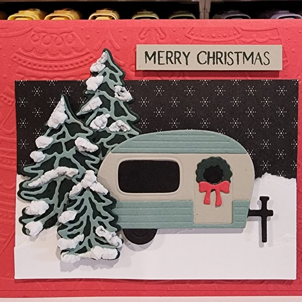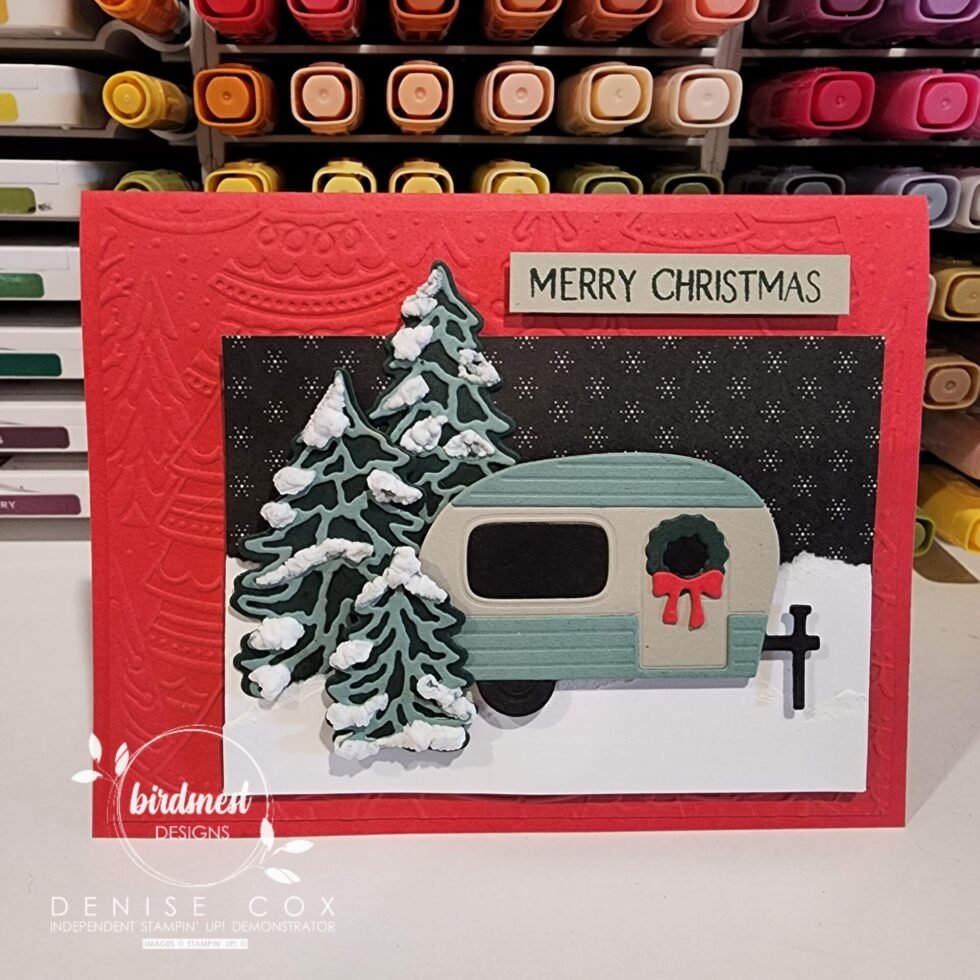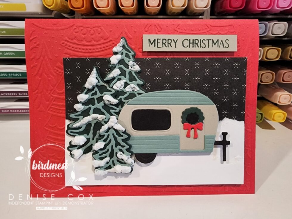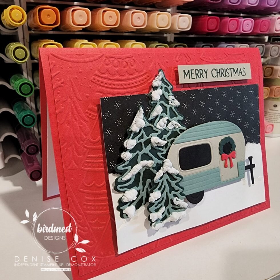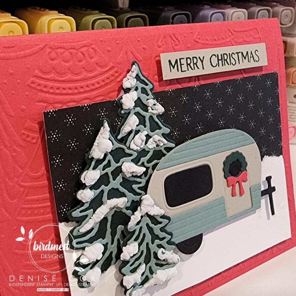 - Tuck the back end of the trailer amongst the trees and adhere with stampin’ dimensionals (I used scotch tape on the back of the trailer to hold the windows in place)