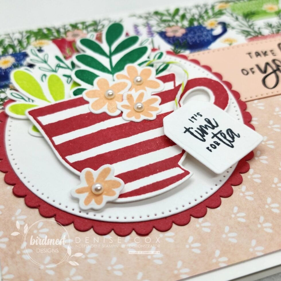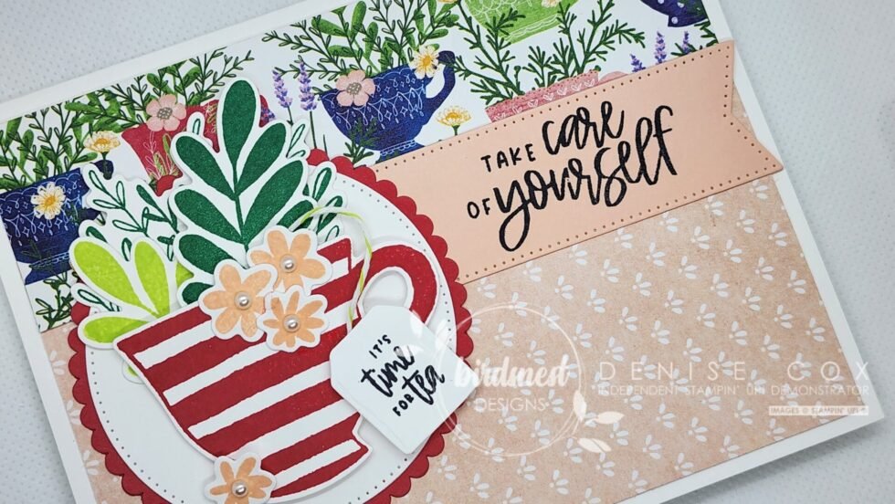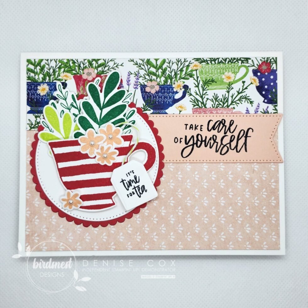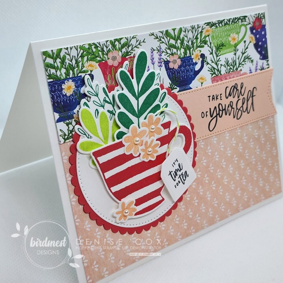 Today’s card is filled with a little extra love and would be perfect for a tea-loving friend.  All of the products in the Tea Boutique suite are so pretty, filled with beautiful tea themed imagery and gorgeous colours.  The sentiment that I used on today’s card is Take Care of Yourself and so I felt it would be fitting if there was a place to hold a tea bag inside the card.