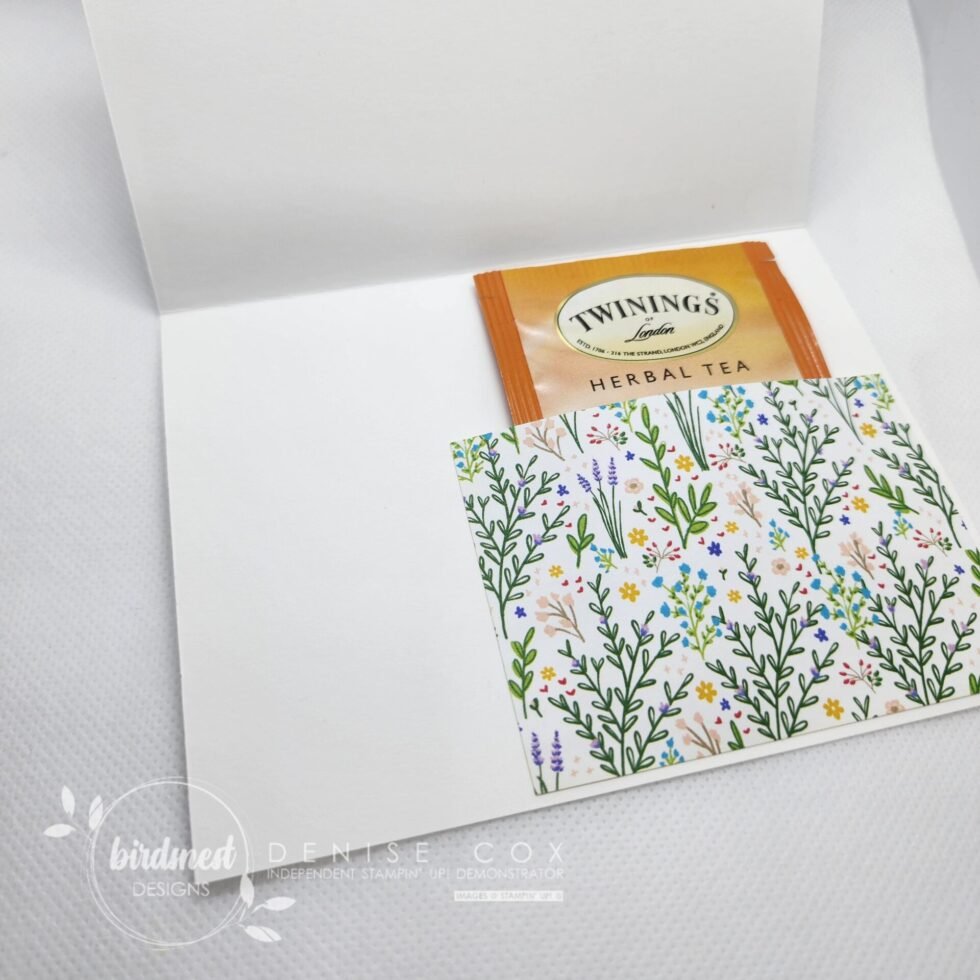For the inside of the card I cut another piece of Designer Series Paper and adhered it to create a pocket that would hold a single tea bag.