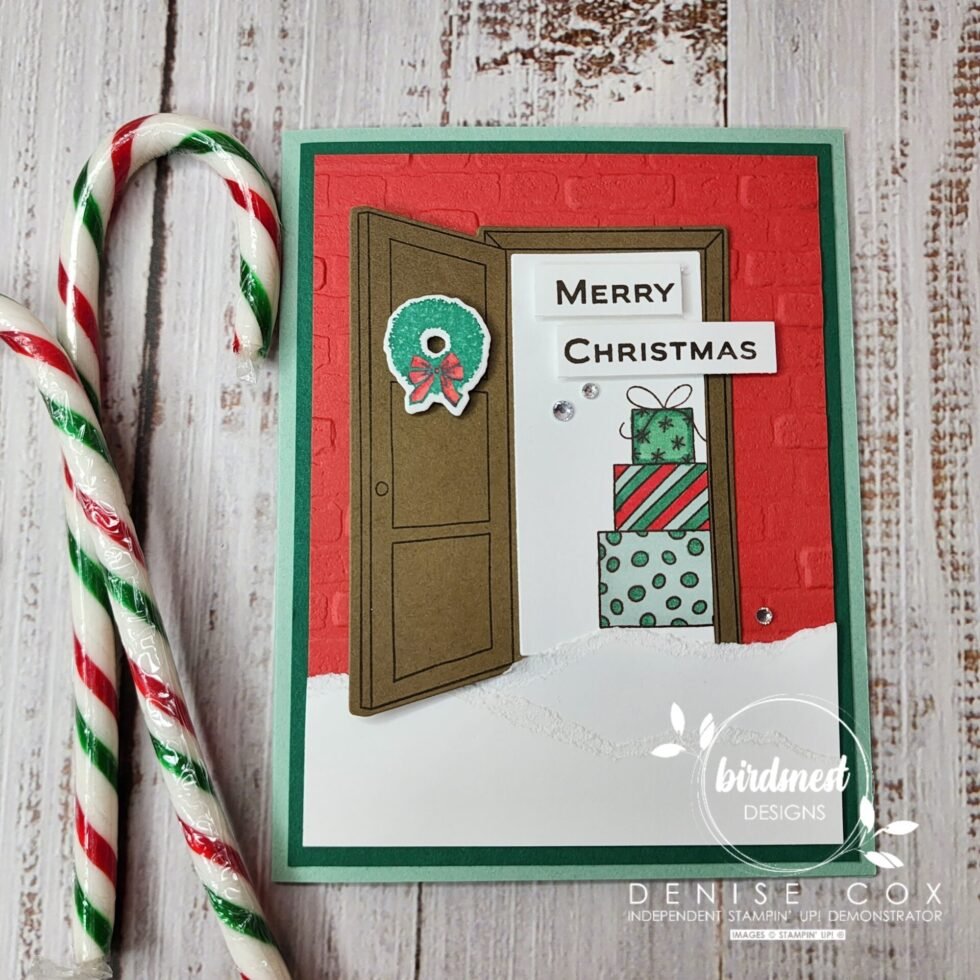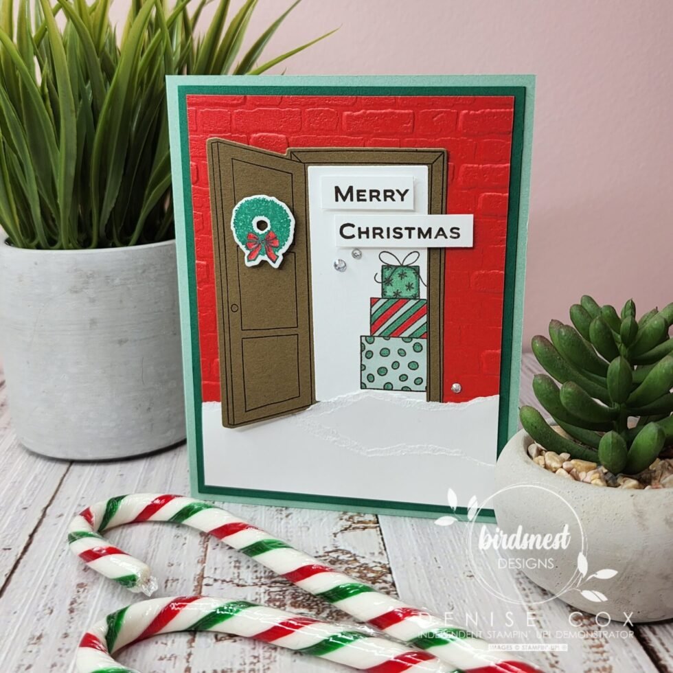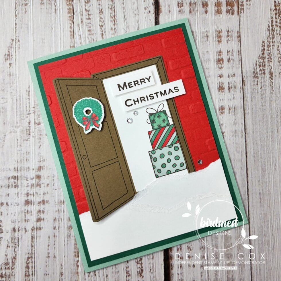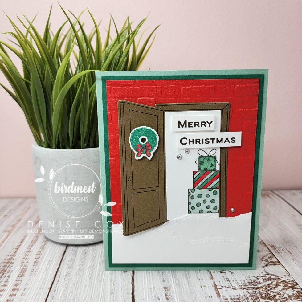 - Stamp the door image with Early Espresso ink on Soft Suede cardstock and die cut with the coordinating die – attach to the card using stampin’ dimensionals and tucking the bottom of the open door part just under the layers of ‘snow’