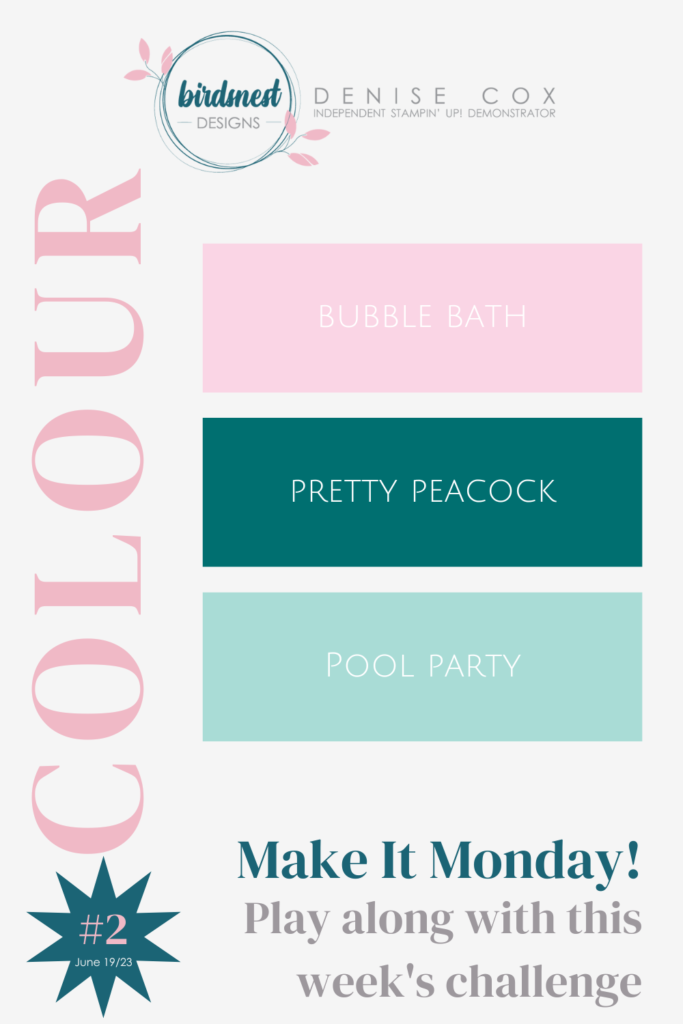 It’s Make It Monday and I have a new weekly challenge for you! This week it is a fun colour combination. The challenge is to use the three colours to design a project and then share it in the Birdsnest Designs Facebook thread. Once your project is complete take a photo and share it in the comments of this post. Together we will create a fun thread for everyone to take a look at! At the end of the month I will be drawing a prize for one lucky person that participates in the challenges! I invite everyone to play along but prizes can only be mailed to Canadian addresses as per Stampin’ Up! policy.