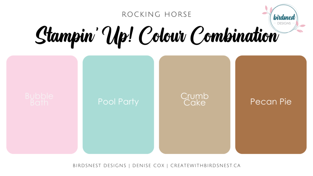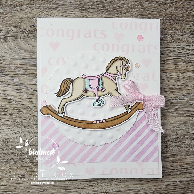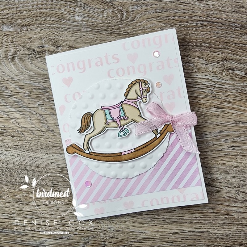 During today’s video I introduced the week’s creative challenge and followed along with the sketch to create this Rocking Horse baby card. I’d love to have you play along too! When you complete your project take a photo and share it in the comments of the challenge post in my Facebook Creative Corner group.