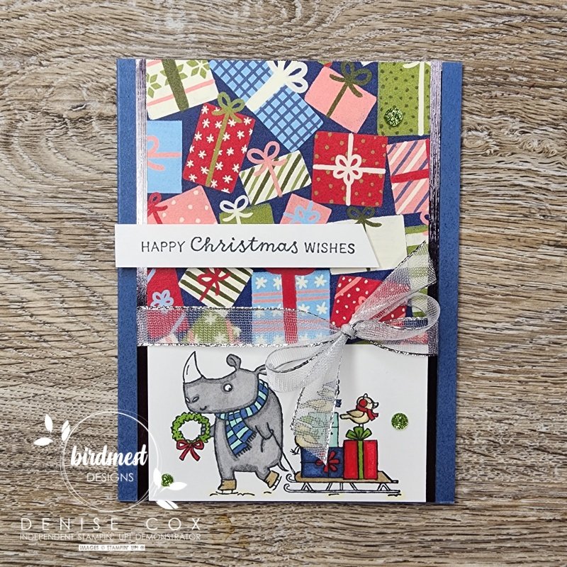 I love how great this card turned out using the sketch challenge and the Beary Christmas Designer Series Paper. The coordination of Stampin’ Up! products is one of the things I love best. Look how well the Festive & Fun rhino stamp goes with the gift pattern in the Beary Christmas Designer Series Paper! Love it ❤️