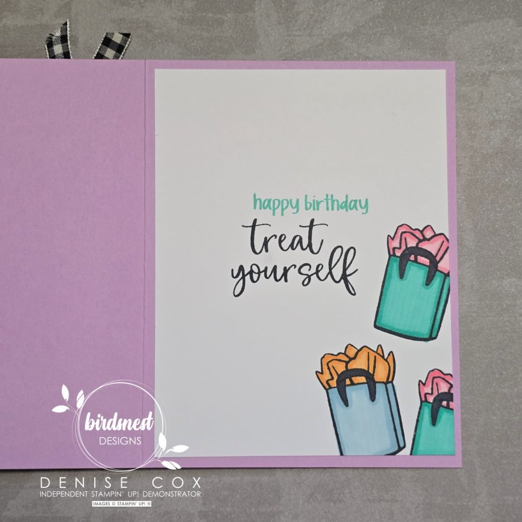 - Using Summer Splash ink stamp HAPPY BIRTHDAY then stamp TREAT YOURSELF below with black ink