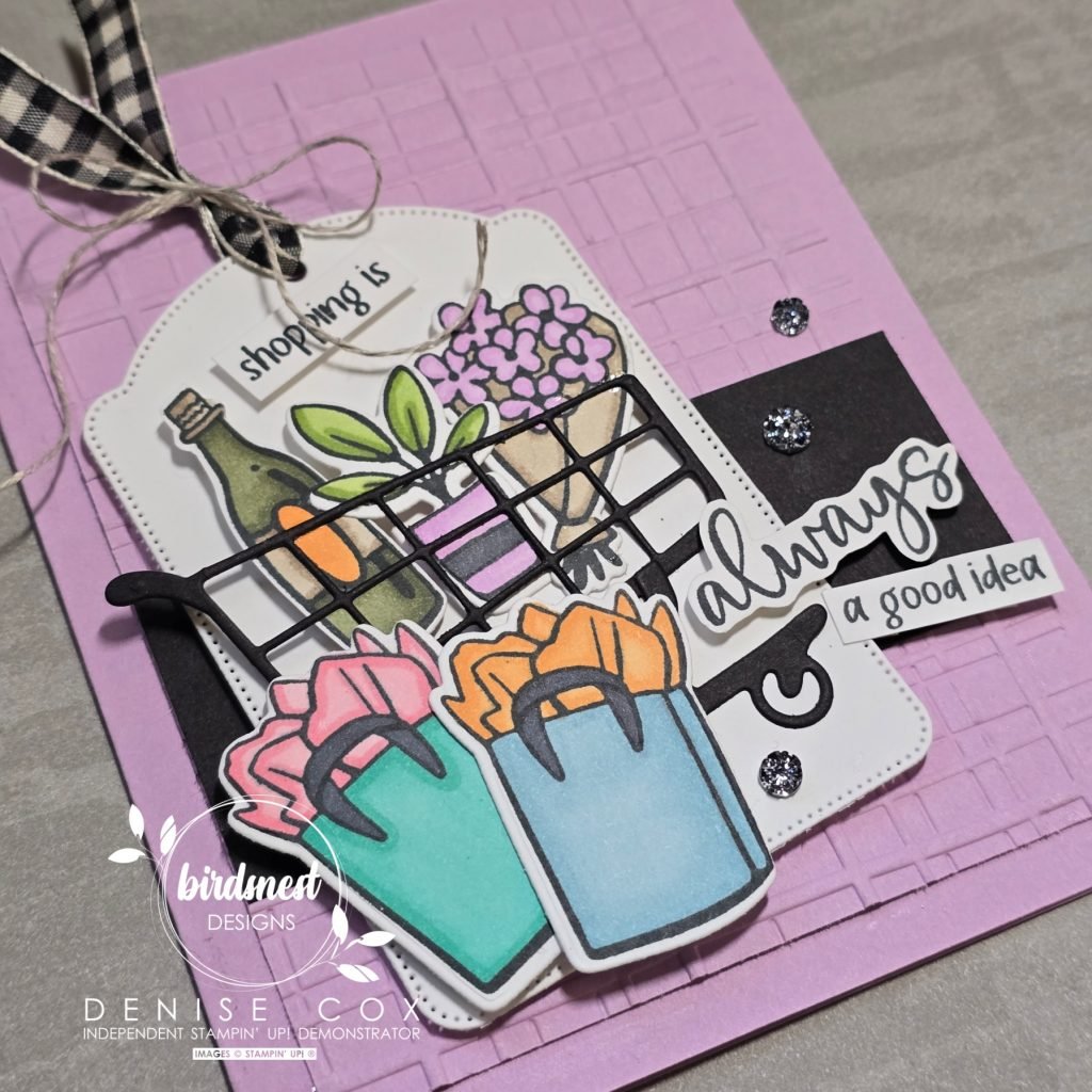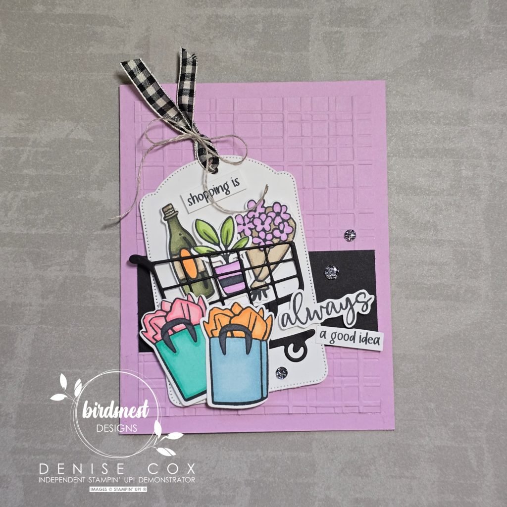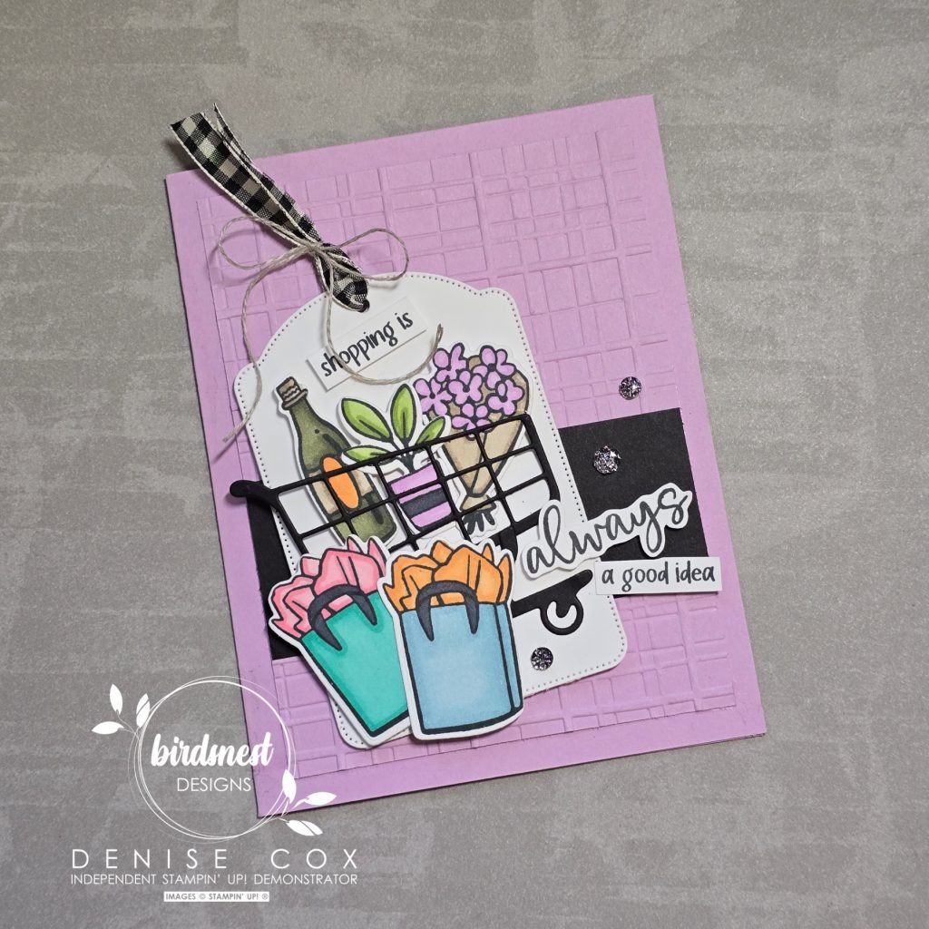 I found this to be an easy inspiration list to choose from… the dilemma for me was which ones to use! I settled on on shopping cart, black and texture. I haven’t used the Stampin’ Up! Attention Shoppers bundle in a while but knew that it was the perfect pick for this challenge.
