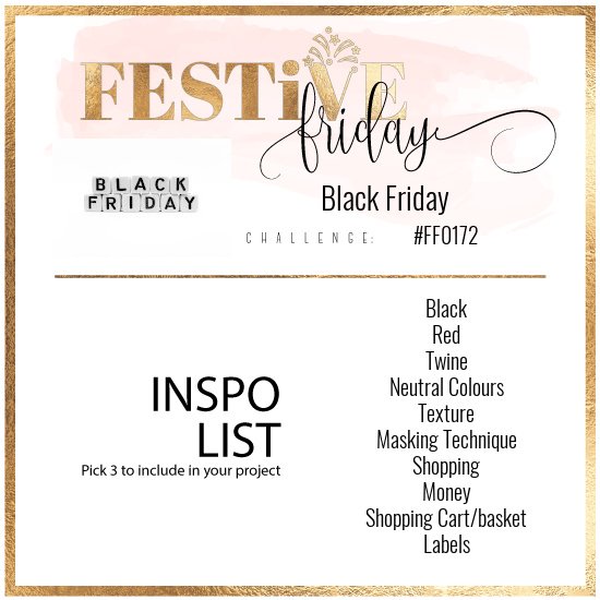 What is the Festive Friday Challenge? Every second Friday we post a challenge for you with a specific theme and an Inspo (Inspirations) List. The Inspo List is 10 items you can choose from to create your project. Pick three of these items to create your project and link up! #festivefridaychallenge Black Friday is this week’s theme but guess what? Your project doesn’t have to be about Black Friday at all! I hope you’ll join in on the fun and make a card, scrapbook page or 3-D item for this week’s challenge!