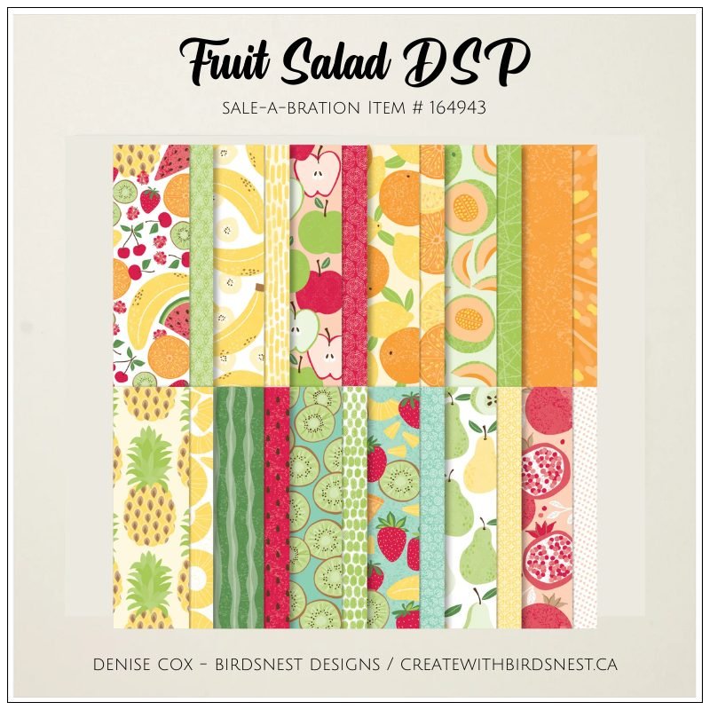 The Fruit Salad 6″ x 6″ Designer Series Paper is available for free with a $75 order here in Canada during Sale-A-Bration. Sale-A-Bration is Stampin’ Up!’s biggest promotion of the year and runs from January 7th through February 28th.