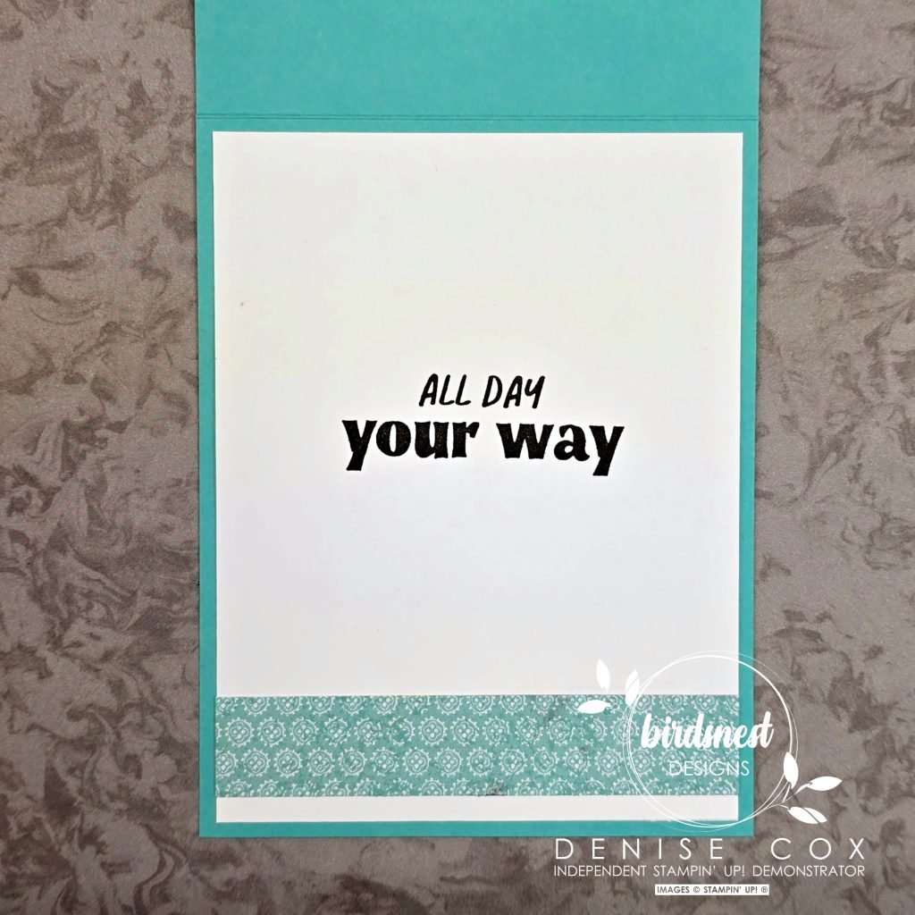 I stamped a simple HAPPY BIRTHDAY on a banner across the front and added the fun ALL DAY YOUR WAY greeting on the inside of the card. Both of these sentiments are from the Day To Celebrate stamp set, another Sale-A-Bration exclusive. There are so many wonderful products to choose from this year … which one will you pick first?