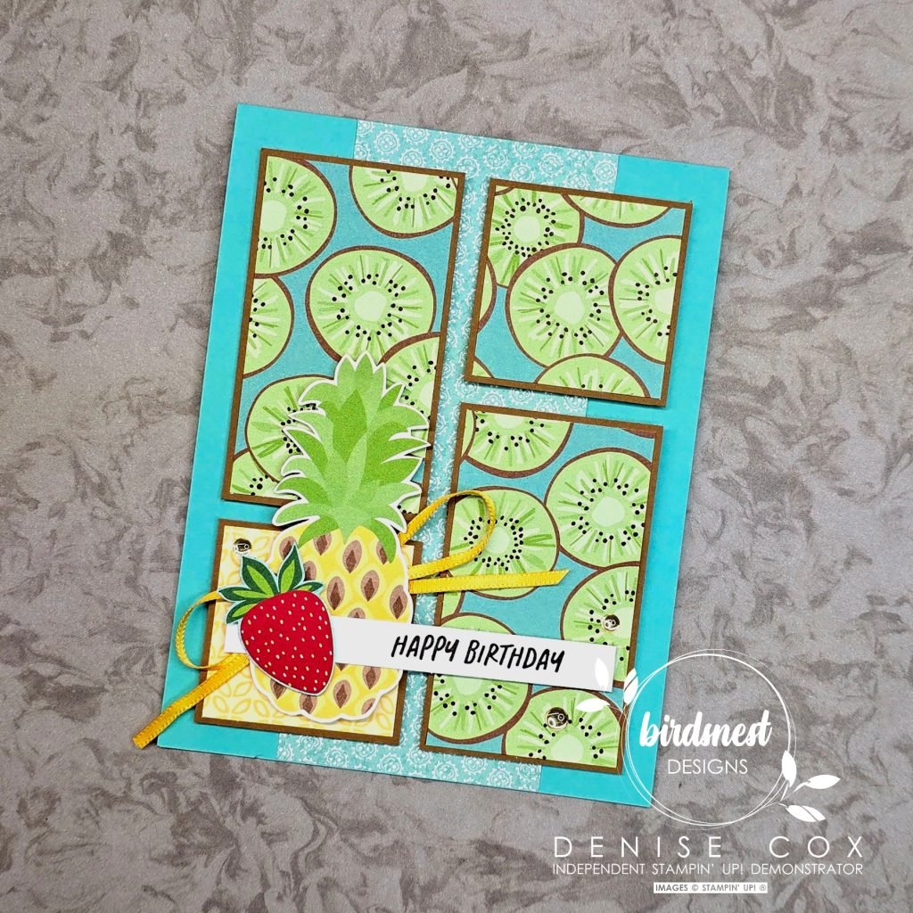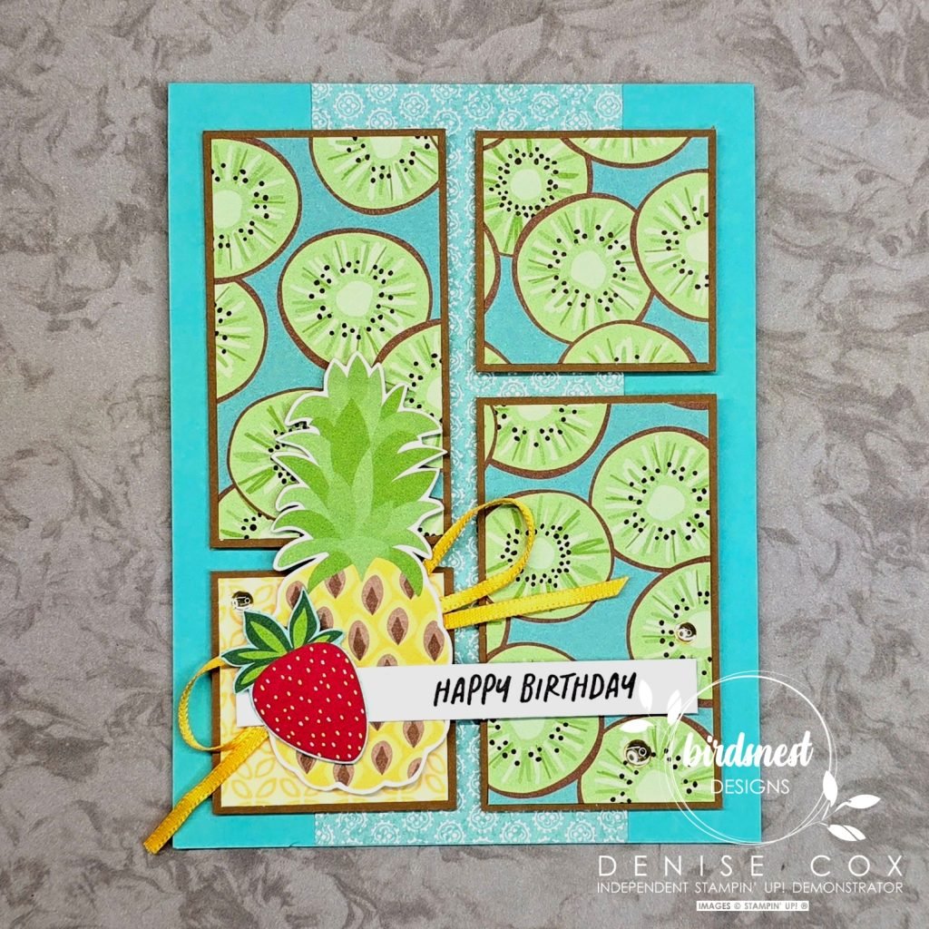 The large, bright fruit images are perfect to fussy cut and use as embellishments or focal points on your creations. For this card I used the fun pineapple and added a pop of red with a single strawberry layered on top.