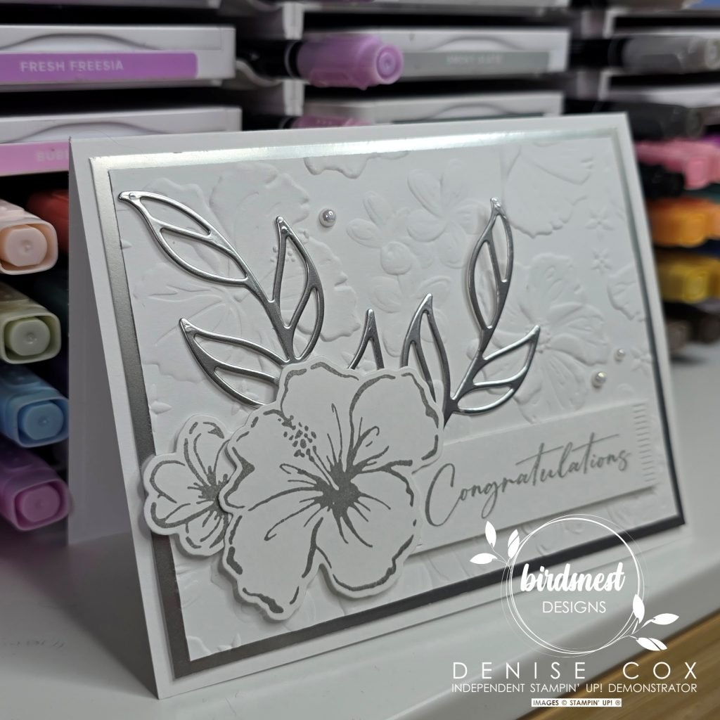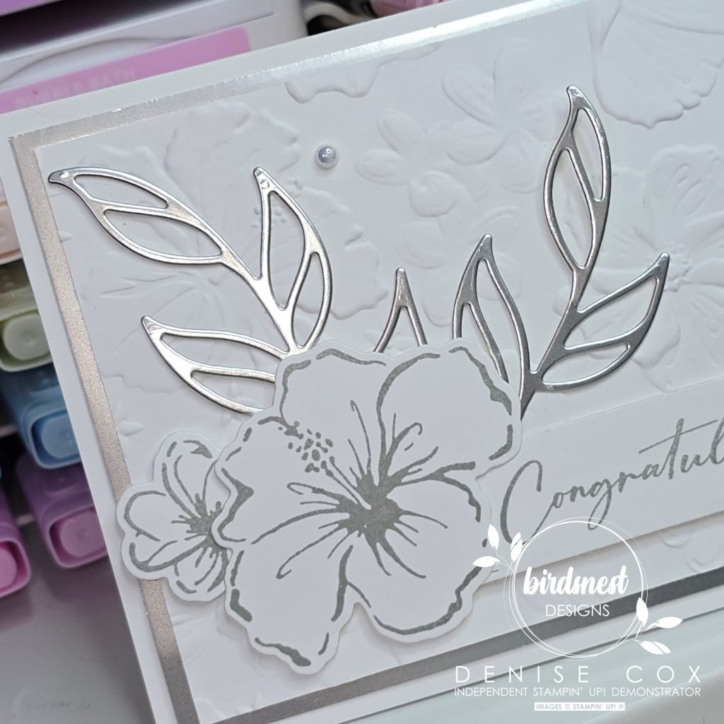- Cut a 3-3/4 x 5 Basic White piece, emboss with the Happy Hibiscus Hybrid Embossing folder and layer to the Silver Foil