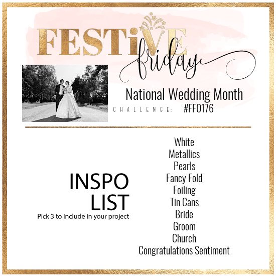 What is the Festive Friday Challenge? Every second Friday we post a challenge for you with a specific theme and an Inspo (Inspirations) List. The Inspo List is 10 items you can choose from to create your project. Pick three of these items to create your project and link up! #festivefridaychallenge National Wedding Month is this week’s theme but guess what? Your project doesn’t have to be about this theme at all! I hope you’ll join in on the fun and make a card, scrapbook page or 3-D item for this week’s challenge!