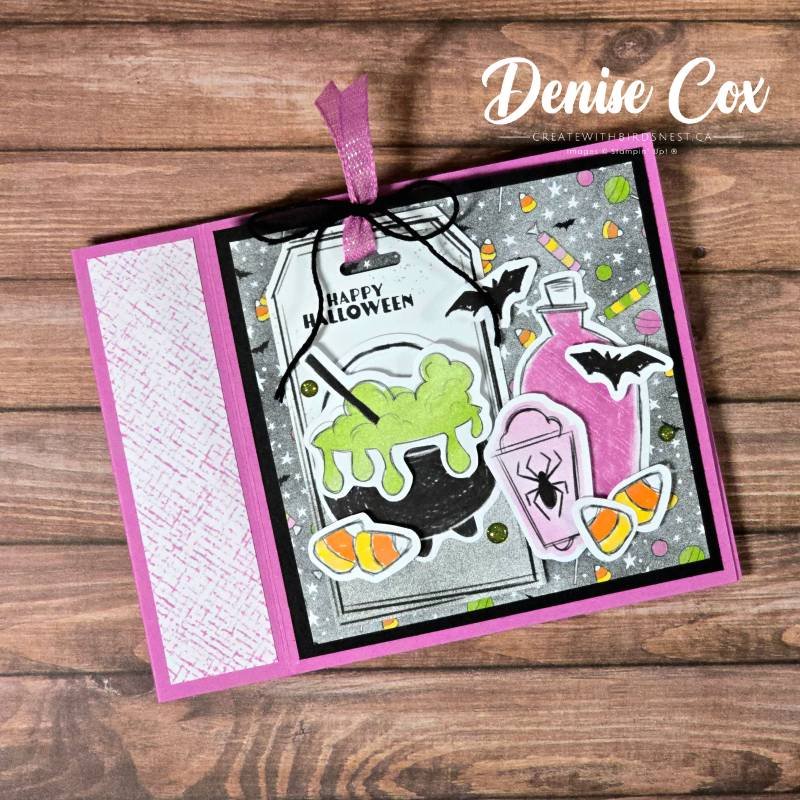 Talk about playful Halloween vibes! With bright pops of green and purple and candy-corn accents, it’s spooky but sweet. I used the current Spooky Sweet Designer Series Paper with the Playful Ghosts stamp set for this project — now retired but still so much fun to play with.