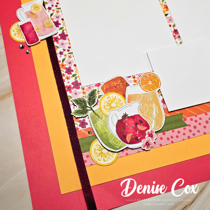 This is the scrapbook page I created live during the video using Stampin’ Up! Celebratory Sips Designer Series Paper. I was craving bright colours and a summer vibe, especially with winter still hanging on here in Saskatchewan.