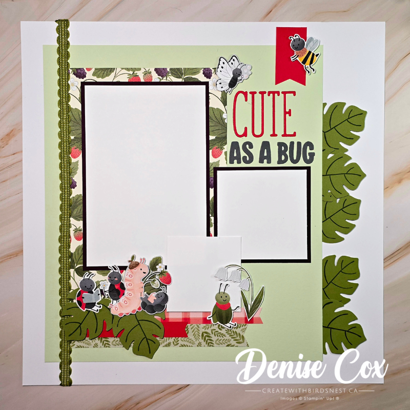 This layout was created ahead of time using the same sketch, but with a completely different look and feel. I used Stampin’ Up! Cute as a Bug Designer Series Paper and pulled in a retired Tropical Leaf bundle from my stash to replace the circular elements in the sketch with leafy shapes.