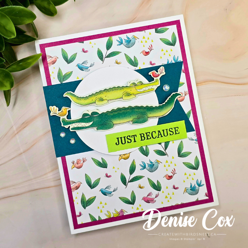 This bright, playful paper pairs perfectly with the cute crocodiles. I love how the two images stretch across the circle, and the Lemon Lime Twist sentiment adds a cheerful pop of colour.