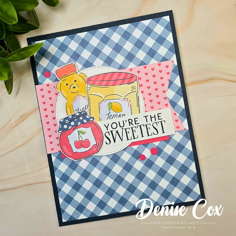 I couldn’t resist the gingham pattern paired with the sweet little jars and honey bear. The layered jars tucked behind the sentiment create such a fun focal point, and those Strawberry Slush dots finish it off perfectly.
